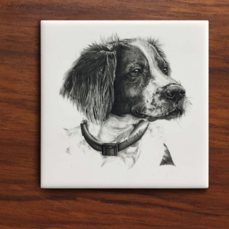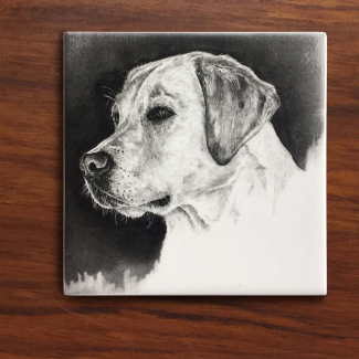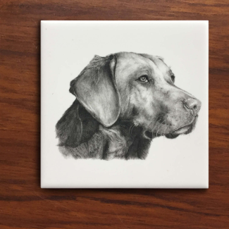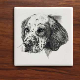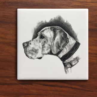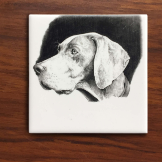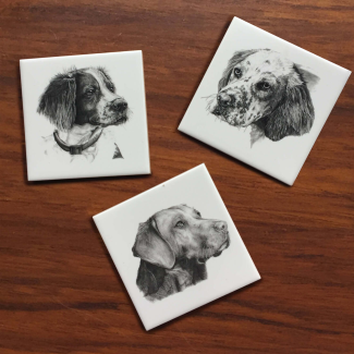 Sold as a set of 6, these tiles are prints of original graphite drawings that have been carefully transferred and kiln fired for protection onto tiles to be used as coasters. A must-have for the dog lover, outdoorsman and one who appreciates uniqueness. The tiles come with a soft protective under-layer that will prevent your furniture from scratching.