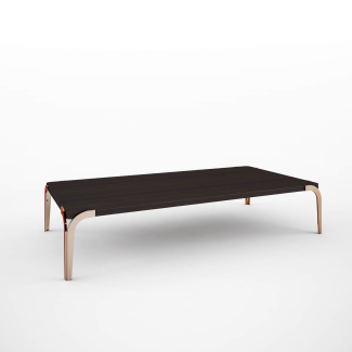 Sleek, understated and elegant, this centre table has rich copper finish steel legs that are shaped around the corners of the top and are held together with a brace. The polished wooden top made out of wenge veneer with a wooden trim complements the minimalist lines of this design.