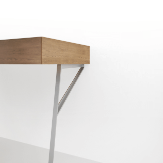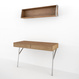 This wooden desk with soft close drawers is designed to be firmly mounted on the wall with simple fixtures. Legs fabricated from high-grade steel support the teak wood finished veneer desk, completed with a clear-coat of superior polish.
