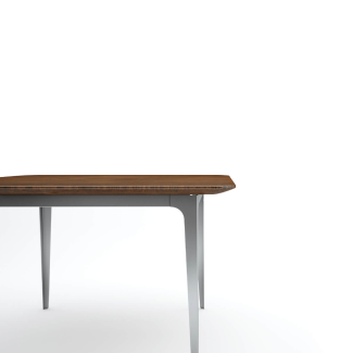This range of furniture explores the intrigue of the liaison between warmth and cool-chic. The dining table with a magnificent walnut wood veneer top is trimmed with a wooden edge. This rests on an intelligently designed, knock-down, stainless steel base. The wood is finished in clear polish with a brushed steel base.