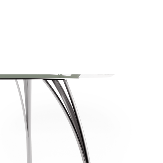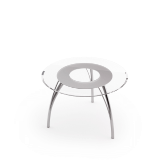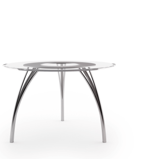 This centre table has a carefully crafted base of steel straps that twist elegantly and are fastened onto a laser cut circular plate to support a toughened clear glass top.