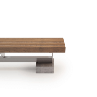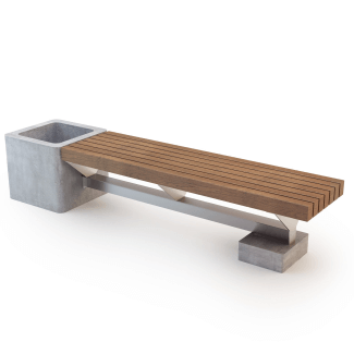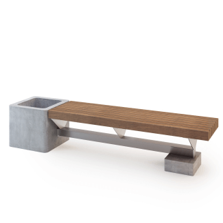 A robust outdoor bench with a linear slatted teak wood seat intelligently integrates a stone planter into its steel structure, allowing nature to complement the design.