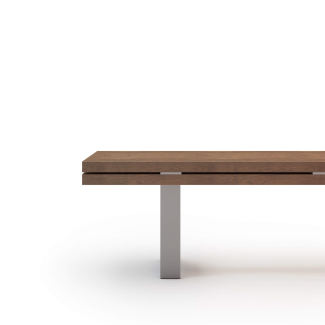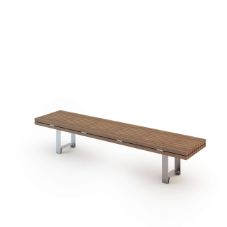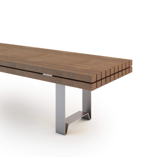 This is a modern adaptation of the traditional patio bench. Its solid wooden slats form a seat that is bolted onto a sturdy brushed steel base.