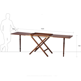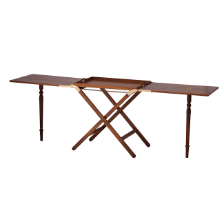 A well crafted tray table which extends out to make a long, serving table by screwing in two turned legs onto the flaps. This piece of furniture has accents of brass hardware which are functional yet aesthetic. A piece of furniture that fits into any home and garden.