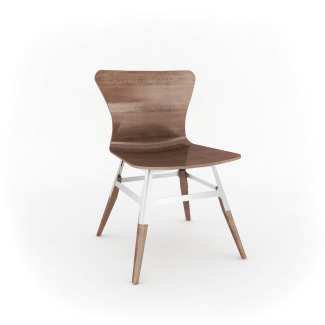 This contemporary yet classic chair has an ergonomic wooden seat and backrest which are supported by a formed steel base structure and walnut wood legs. The wood is finished with a clear coat of polish that mimics the sheen of the steel frame.