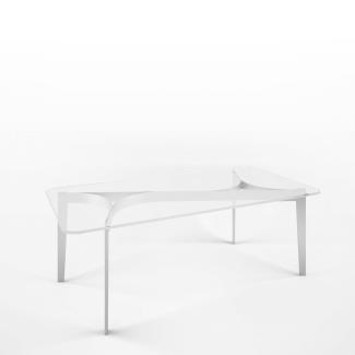 Transparency and clean lines are core to this concept furniture. This dining table has a carefully fabricated laser cut base of steel straps that are elegantly curved and are fastened to each other. This supports a toughened clear glass top which allows the user to exult in the aesthetic of the exposed structure.