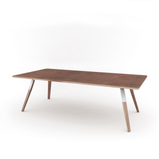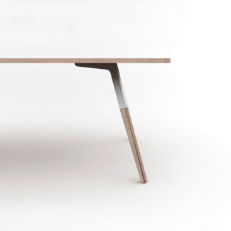 Brushed finish stainless steel base frame with solid wood legs, Walnut veneer top with solid wood trims in matte finish