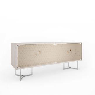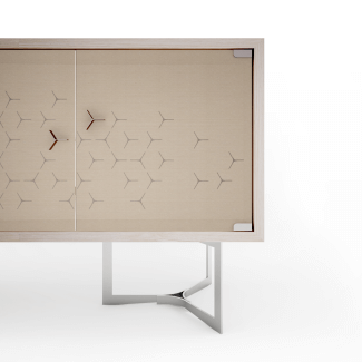 This oak wood veneer sideboard with pivoted glass doors rests on a steel base made from triads of steel sections intelligently held together with custom designed hardware.