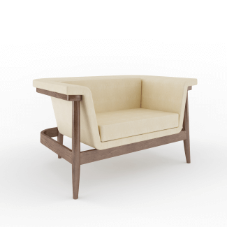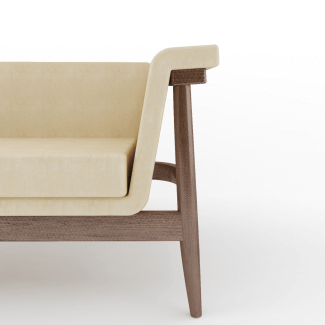 A visually light sofa with an ergonomic recline, this dramatic piece combines a cushioned seat that rests lightly on a sturdy wooden frame for ease and style. The frame is made out of high quality teak wood which is polished and stained to perfection. The seat shell and cushions are upholsterd in a soft and textured fabric.